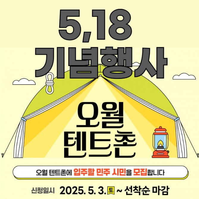 매년 5,18 기념 행사를 하고 있습니다. 25년에는 오월 텐트촌 이라는 이름으로, 텐트에서 숙박할 수 있는 기회를 제공한다고 합니다.